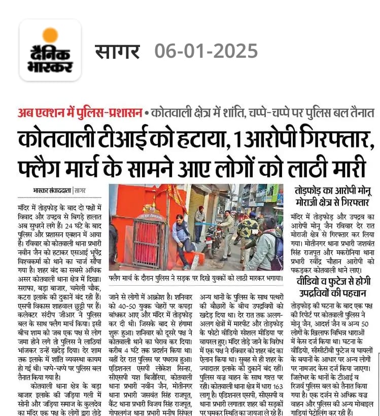 मामले में पुलिस ने मोनू महाकाल, आदर्श जैन सहित अन्य अज्ञात लोगों पर एफआइआर दर्ज की है। वहीं प्रदर्शन में खुद पर पेट्रोल डालकर आग लगाने का प्रयास करने वाले नीरज जैन नाम के युवक को भी पुलिस ने हिरासत में लिया, लेकिन बाद में उसे छोड़ दिया गया। वहीं बताया जा रहा है कि पुलिस अधिकारियों ने धार्मिक स्थल के पास ड्यूटी में लापरवाही करने पर एक प्रधान आरक्षक और एक आरक्षक को लाइन अटैच किया है।