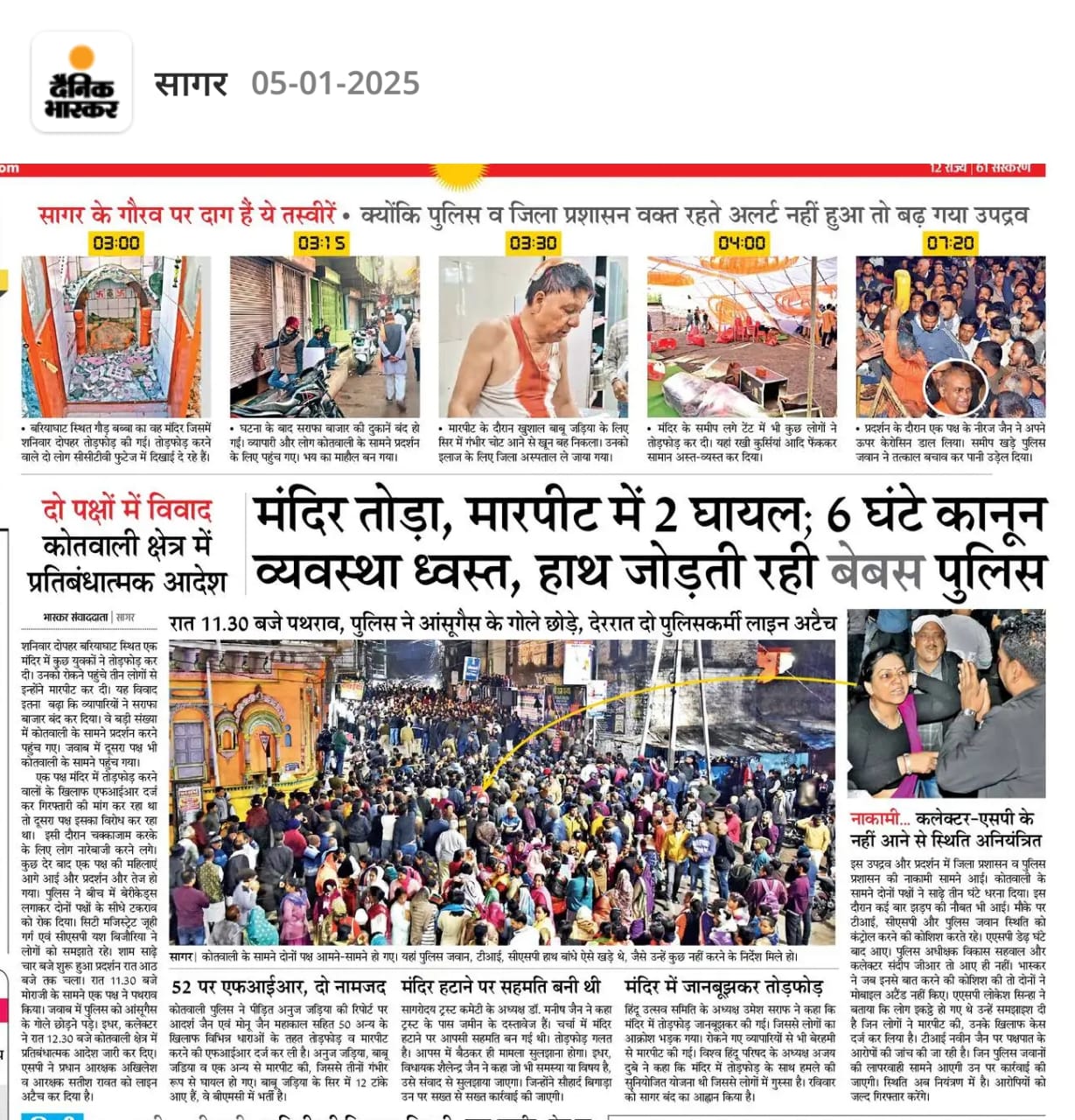 पुलिस ने जब मढ़िया के पुनर्निर्माण का आश्वासन दिया तो इस बात से जैन समाज आक्रोशित हो गया। समाज के लोग कोतवाली के पास जमा हो गए। दोनों समुदाय एक स्थान पर होने से तनाव की स्थिति बन गई। कोतवाली के सामने जब दोनों पक्ष जमा हुए तो पुलिस सिर्फ मूक-बधिर बनी रही।