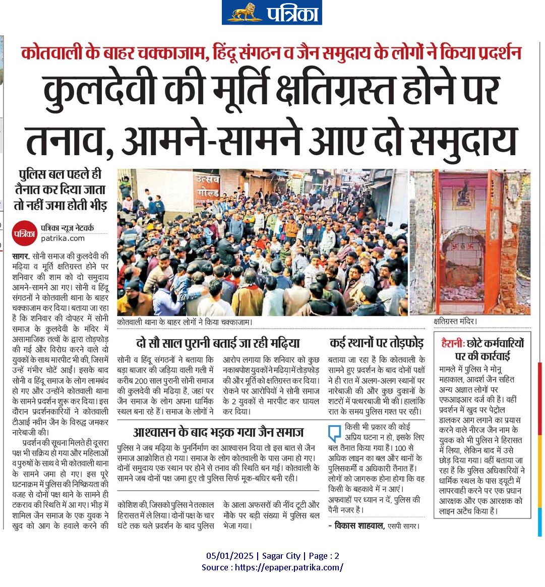 सोनी समाज की कुलदेवी की मढ़िया व मूर्ति क्षतिग्रस्त होने पर शनिवार की शाम को दो समुदाय आमने-सामने आ गए। सोनी व हिंदू संगठनों ने कोतवाली थाना के बाहर चक्काजाम कर दिया। बताया जा रहा है कि शनिवार की दोपहर में सोनी समाज के कुलदेवी के मंदिर में असामाजिक तत्वों के द्वारा तोड़फोड़ की गई और विरोध करने वाले दो युवकों के साथ मारपीट भी की, जिसमें उन्हें गंभीर चोटें आईं। इसके बाद सोनी व हिंदू समाज के लोग लामबंद हो गए और उन्होंने कोतवाली थाना के सामने प्रदर्शन शुरू कर दिया। पढ़िए यह विशेष रिपोर्ट…