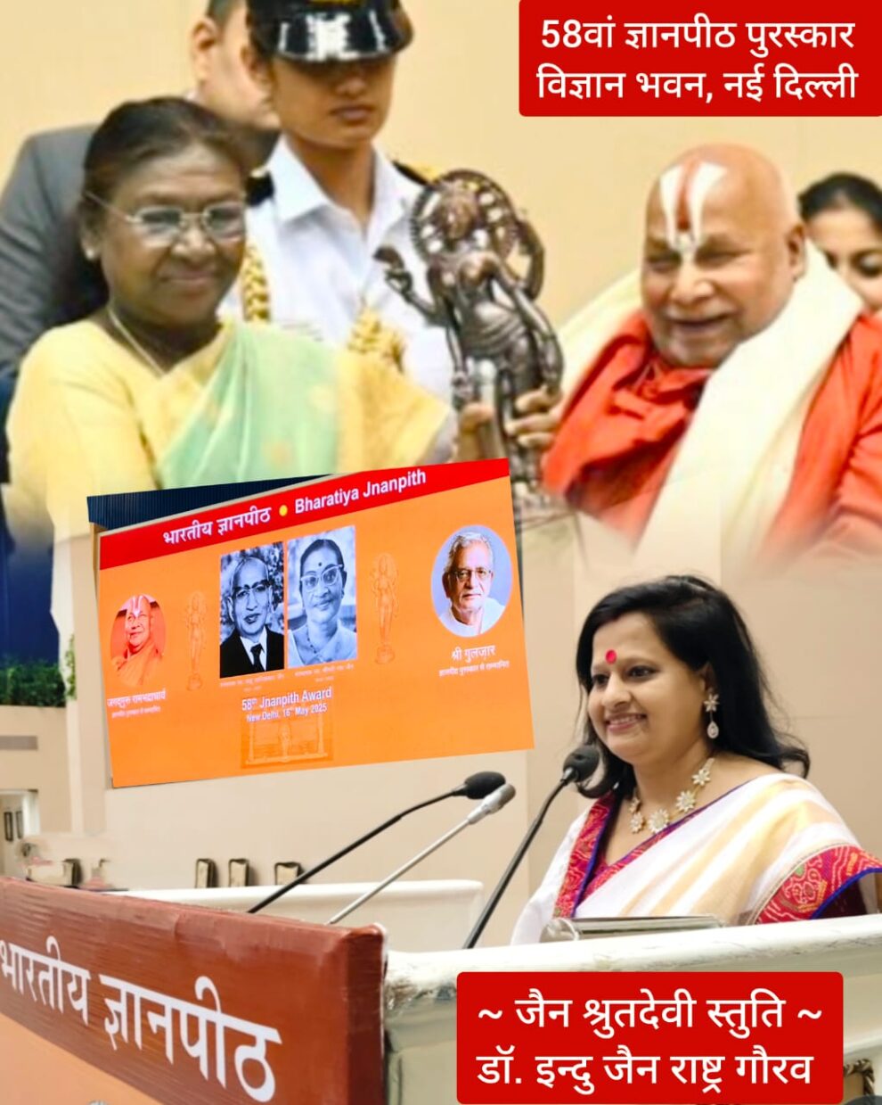 इस अवसर पर भारत की राष्ट्रपति श्रीमती द्रौपदी मुर्मू ने संस्कृत के महान विद्वान जगद्गुरु रामभद्राचार्य जी को 58वां ज्ञानपीठ पुरस्कार प्रदान किया। उन्होंने इस अवसर पर कवि गुलज़ार को भी परोक्ष रूप से सम्मानित करते हुए उन्हें शुभकामनाएं प्रेषित कीं।