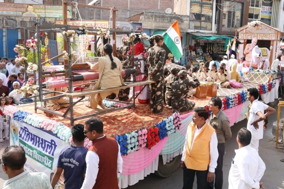 आज मध्यान्ह में आध्यात्म की प्रतिभूति आचार्य श्रेष्ठ विद्यासागर महाराज के चरण चिन्ह दयोदय पशु संरक्षण केन्द्र गौशाला से प्रभावना पूर्वक नगर में आए। जिनकी अगुवाई नेहरू महाविद्यालय के सम्मुख दिगम्बर जैन पंचायत समिति के नेतृत्व में सम्पूर्ण समाज ने गाजे-बाजे के साथ की। धार्मिक धुन जय-जयकारों के साथ भव्य शोभायात्रा के रुप में रजत रथ में विराजित कर आचार्यश्री के चरण चिन्हों को लेकर श्रावक भक्तिपूर्वक चल रहे थे। इसके आगे आगे आचार्यश्री द्वारा सम्पूर्ण समाज को दिए गए संदेश इण्डिया नहीं भारत बोलो, प्रतिभास्थली, हथकरघा, गौशाला आदि की झांकी सुसज्जित कर प्रतिभास्थली के बच्चे विशेष वाहन पर सवार थे। आगे-आगे अश्वांे पर जहां ध्वज पताकाएं लिए हुए श्रेष्ठीजन थ,े वहीं बग्गियों में श्रेष्ठीजन चरण चिन्ह प्रतीकात्मक लेकर चल रहे थे। शोभायात्रा में आगे-आगे हाथी पर सवार ध्वज पताकाएं लिए हुए युवक थे। तो वहीं बुन्देली नृत्य करते हुए कलाकार आगे-आगे चल रहे थे।