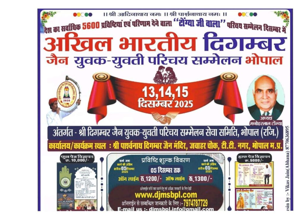 राजधानी भोपाल में विश्व प्रसिद्ध दिगंबर जैन समाज का टोंग्या जी वाला युवक-युवती परिचय सम्मेलन 13 से 15 दिसंबर तक आयोजित होगा। इसमें अभी तक 3100 रजिस्ट्रेशन हो चुके हैं और रजिस्ट्रेशन चालू है। इंदौर से पढ़िए, यह खबर…