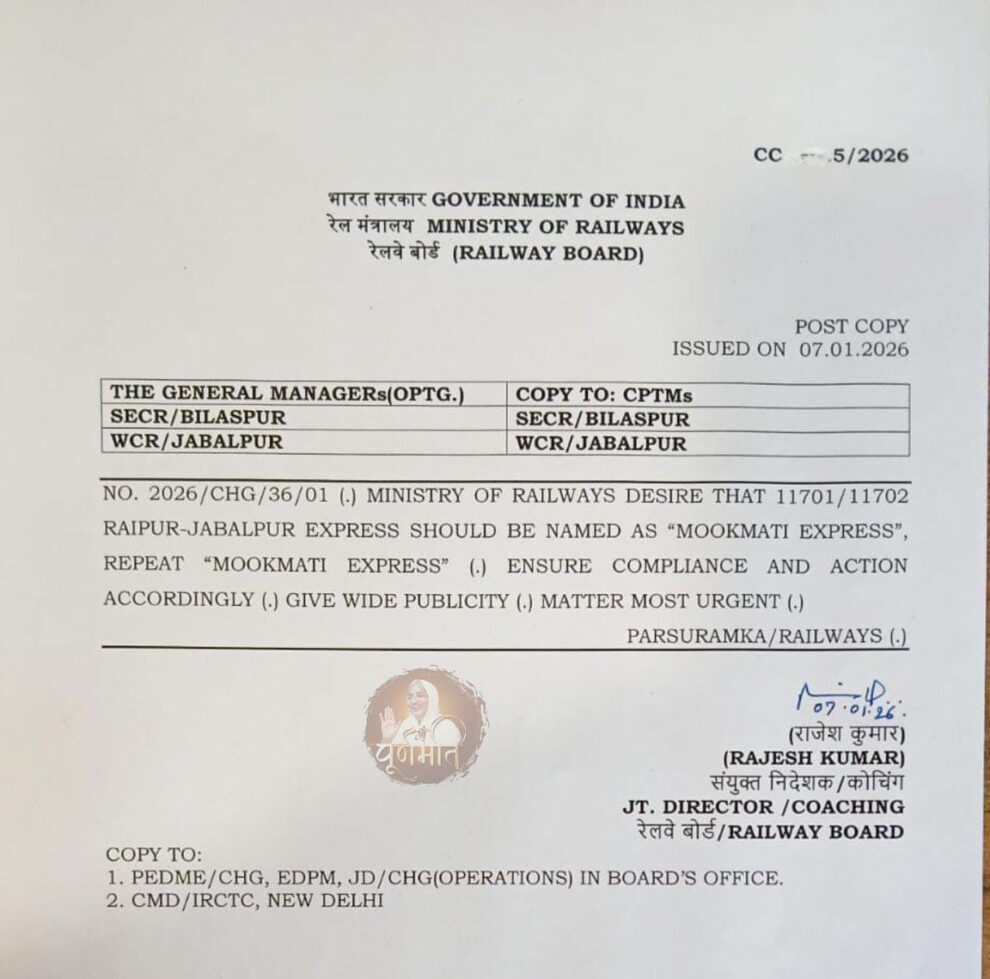 जबलपुर-रायपुर (वाया डोंगरगढ़) इंटरसिटी एक्सप्रेस (गाड़ी संख्या 11701/11702) को भारत सरकार के रेल मंत्रालय की ओर से आचार्य श्री विद्यासागर जी महाराज की मोक्षस्थली मूकमाटी के पावन नाम पर ‘मूकमाटी एक्सप्रेस’ नाम प्रदान किए जाने का आधिकारिक आदेश जारी कर दिया गया है। जबलपुर से पढ़िए, यह खबर…