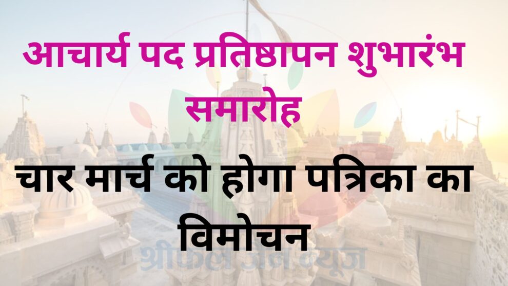 पारसोला। आचार्य पद प्रतिष्ठापन शुभारंभ समारोह के पहले दिन 4 मार्च को प्रातः 11.30 बजे पत्रिका का भव्य विमोचन किया जाएगा। 50 फीट लंबे बैनर के साथ भव्य विमोचन किया जायेगा। इसके लिए प्रातः 7 बजे सेक्टर 4 से एक बस लगेगी जो सर्व ऋतु विलास से होते हुई सेक्टर 11 से होते हुई पारसोला जायेगी और बाकी के सदस्य जो कार से आना चाहते है वो अपने निजी वाहन से 10.30 बजे तक परसोला पहुंचेंगे। भोजन के ठीक पश्चात 11.30 बजे भव्य पत्रिका विमोचन समारोह का आयोजन किया जायेगा। आचार्य पद प्रतिष्ठापन समारोह 13 अक्टूबर से 15 अक्टूबर, तीन दिवसीय कार्यक्रम प्रस्तावित है।