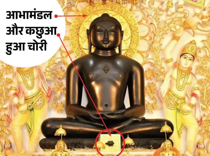 शाहपुरा रोड स्थित प्रसिद्ध मुनिसुव्रतनाथ दिगंबर जैन अतिशय क्षेत्र स्वस्तिधाम मंदिर में गुरुवार रात 12:51 बजे अब तक की सबसे बड़ी चोरी की वारदात को अंजाम दिया गया। चोर मंदिर के गर्भगृह में घुसकर भगवान की प्रतिमा से 1.3 किलो सोने और 3 किलो चांदी से बना आभामंडल, साथ ही श्री यंत्र और धातु से बना कछुआ चोरी कर ले गया। पढि़ए यह विशेष रिपोर्ट…। स्तोत्र दैनिक भास्कर भीलवाड़ा