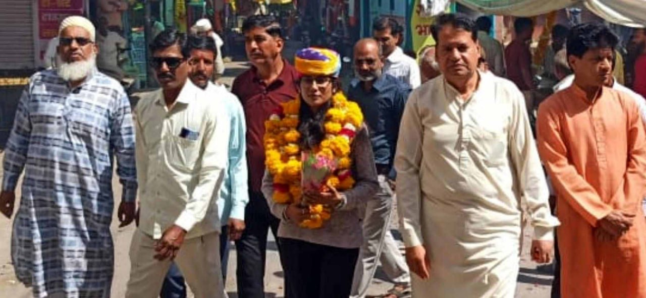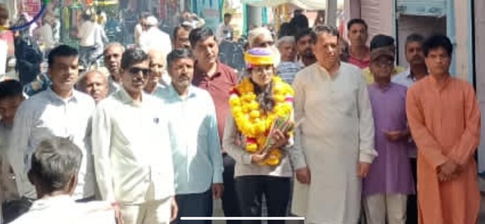 इससे पूर्व क्षेत्र के प्रबुद्धजन श्रीराम मंदिर में एकत्रित हुए। जहां मेघा जैन के हाथों पूजा अर्चना करवाई गई। तत्पश्चात् माल्यार्पण कर शौर्य का प्रतीक साफा पहनाया गया। इस दौरान जमकर आतिशबाजी भी की गई। यहां से मेघा जैन के सम्मान में जुलूस प्रारम्भ हुआ। पूरे नगर में मेघा जैन का स्वागत करने की होड़ सी लग गई।