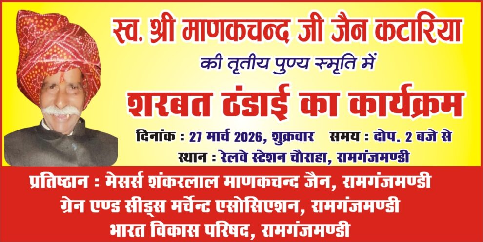 भामाशाह श्रेष्ठी उदारमना व्यक्तित्व के धनी माणकचन्द कटारिया की तृतीय पुण्यतिथि पर शरबत एवं ठंडाई पिलाई जाएगी। कटारिया साहब का व्यक्तित्व एक ऊर्जावान व्यक्तित्व था उनकी स्मृति उनके कार्य को कोई भूला नहीं सकता। रामगंजमंडी से पढ़िए, अभिषेक जैन लुहाड़िया की यह खबर…