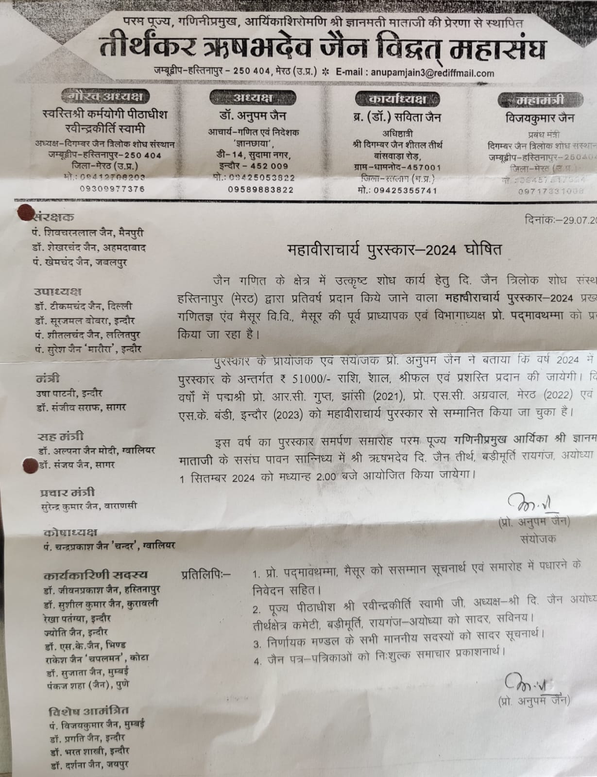 जैन गणित के क्षेत्र में उत्कृष्ट शोध कार्य हेतु त्रिलोक शोध संस्थान हस्तिनापुर (मेरठ) द्वारा प्रतिवर्ष प्रदान किए जाने वाला प्रतिष्ठित महावीराचार्य पुरस्कार 2024 इस वर्ष प्रख्यात गणितज्ञ एवं मैसूर विश्व विद्यालय मैसूर की पूर्व प्राध्यापक प्रोफेसर पद्मावथम्मा को प्रदान किया जाएगा। पढ़िए राजेश जैन दद्दू की रिपोर्ट…