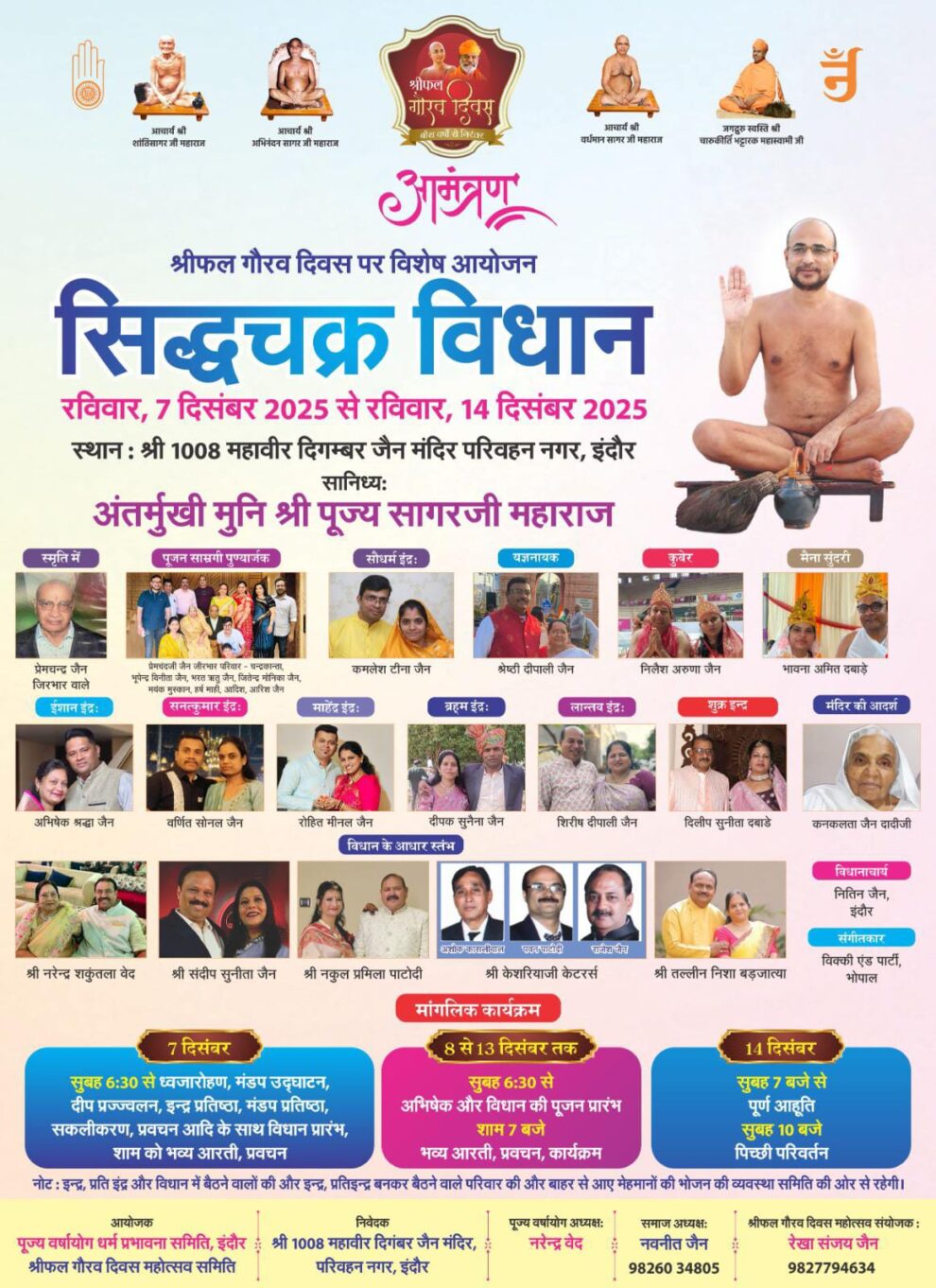 श्री सिद्ध चक्र महामंडल विधान आराधना महोत्सव एवं विश्व शांति महायज्ञ का आयोजन इंदौर के श्री महावीर दिगंबर मंदिर परिवहन नगर में 7 से 14 दिसंबर तक आयोजित किया गया है। अंतर्मुखी मुनि श्री पूज्य सागर जी महाराज ने पूजन के दौरान चढ़ाए जाने वाले द्रव्य किस आशय से चढ़ाए जाते हैं, उन गुणों के बारे में सरल भाषा में बताया। इंदौर से पढ़िए, राजेश पंचोलिया इंदौर की यह खबर…