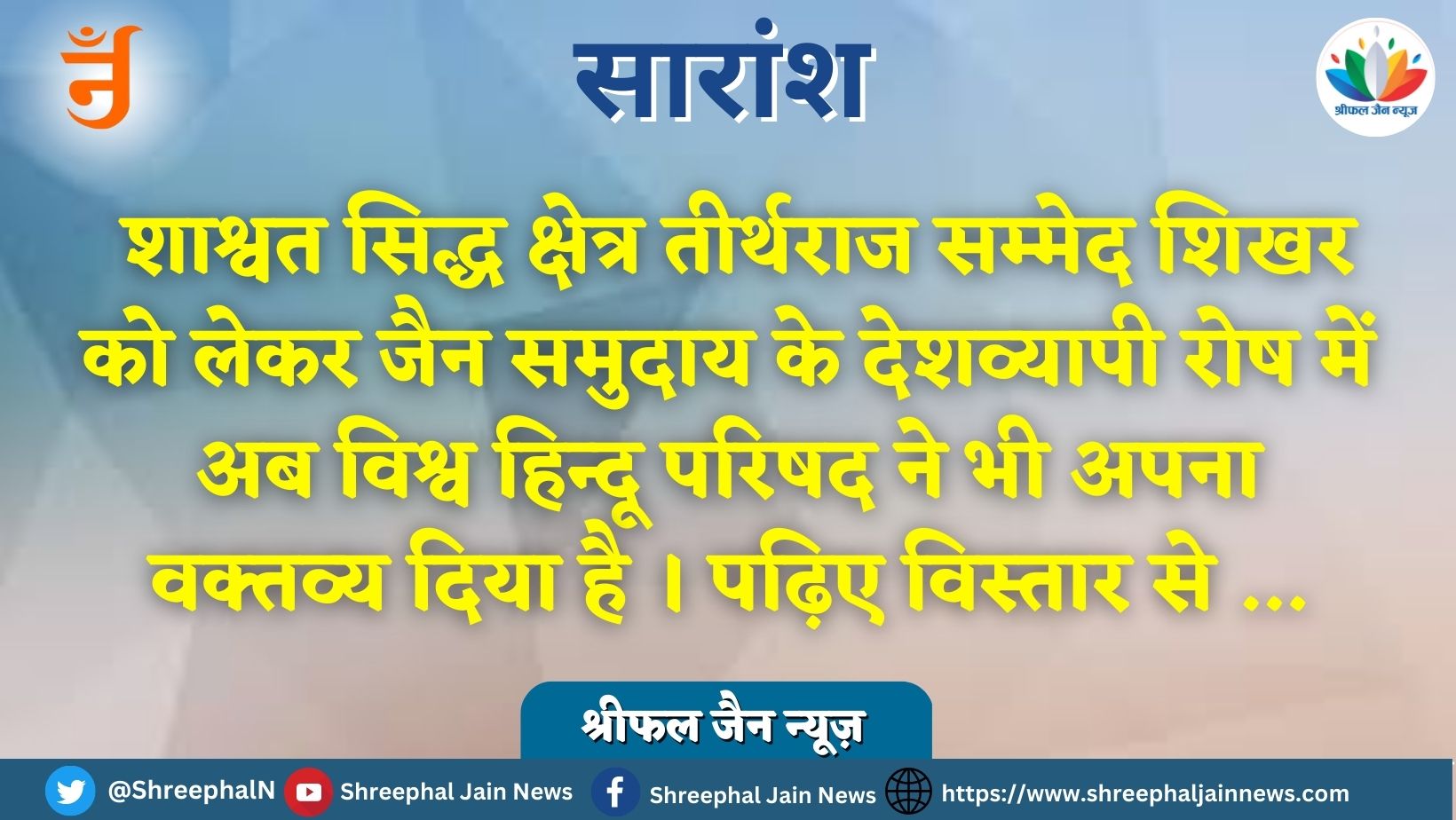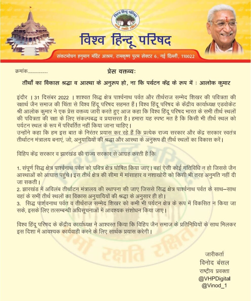 विश्व हिन्दू परिषद ने केन्द्र सरकार और झारखंड की राज्य सरकार से आग्रह किया है कि , संपूर्ण सिद्ध क्षेत्र पारसनाथ पर्वत को पवित्र तीर्थ घोषित किया जाए । वहां ऐसी कोई गतिविधियां न हो जिससे जैन आस्थाओं को आघात पहुंचे ।
