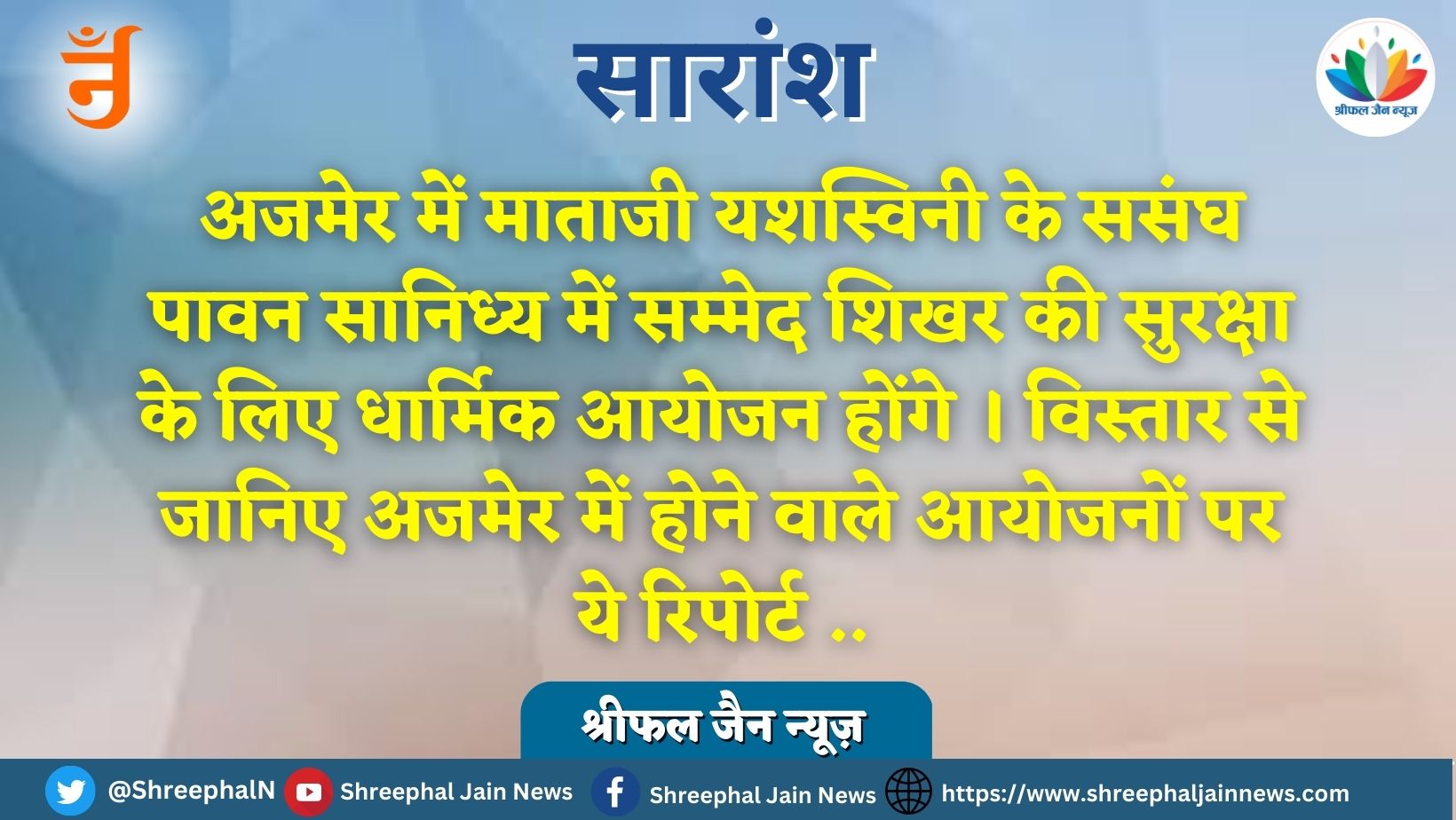 गणिनी आर्यिका 105 यशस्विनी माताजी संसघ के पावन सानिध्य में 31 दिसंबर रात्रि 8:00 बजे से तीर्थ सम्मेद शिखर की सुरक्षा की भावना को सर्वोपरि रखते हुए णमोकार महामंत्र सामूहिक जाप का भव्य आयोजन किया जाएगा ।