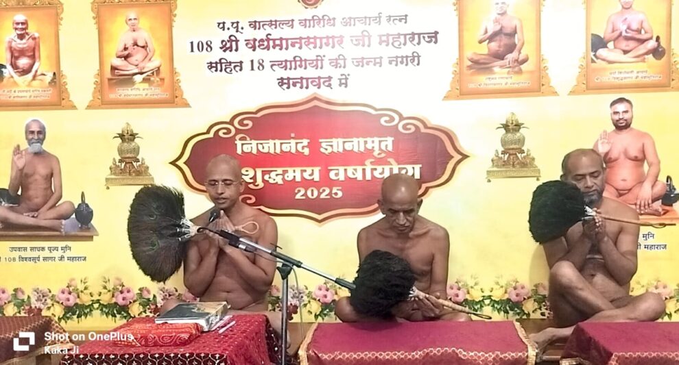 सनावद। त्यागियों की धर्म नगरी में उपाध्याय श्री विभंजन सागर जी का शुक्रवार को मंगल प्रवेश हुआ। सुबह की मंगल बेला में आचार्य श्री विराग सागर जी के परम प्रभावक शिष्य उपाध्याय श्री विभंजन सागर ससंघ सिद्धवरकूट की ओर से शहर में पधारे। समाजजन उनकी अगवानी के लिए रेलवे गेट पर पहुंचे। उपाध्याय श्री ने स्थानीय जिन मंदिरों के दर्शन किए। महिला मंडल द्वारा श्री पार्श्वनाथ दिगंबर जैन बड़ा मंदिर में रंगोली मांडकर उपाध्याय श्री के पाद प्रक्षालन करवाए। उपाध्याय विभंजन सागर जी ने श्री पार्श्वनाथ दिगंबर जैन बड़ा मंदिर में शांतिधारा करवाई। शांतिधारा करने का शौभाग्य कमल केके, रितेश मुंशी, सुनील मास्टर साब, मनीष चौधरी, अनुभव सराफ को प्राप्त हुआ। अगली कड़ी में संत भवन में पूर्व से विराजमान मुनि श्री अक्षय सागर जी एवं उपाध्याय श्री विभंजन सागर जी का मिलन हुआ। दोनों ने एक-दूसरे को नमोस्तु किया। इसी कड़ी में अचित्य जैन ने मंगला चरण प्रस्तुत सभा का शुभारंभ किया।