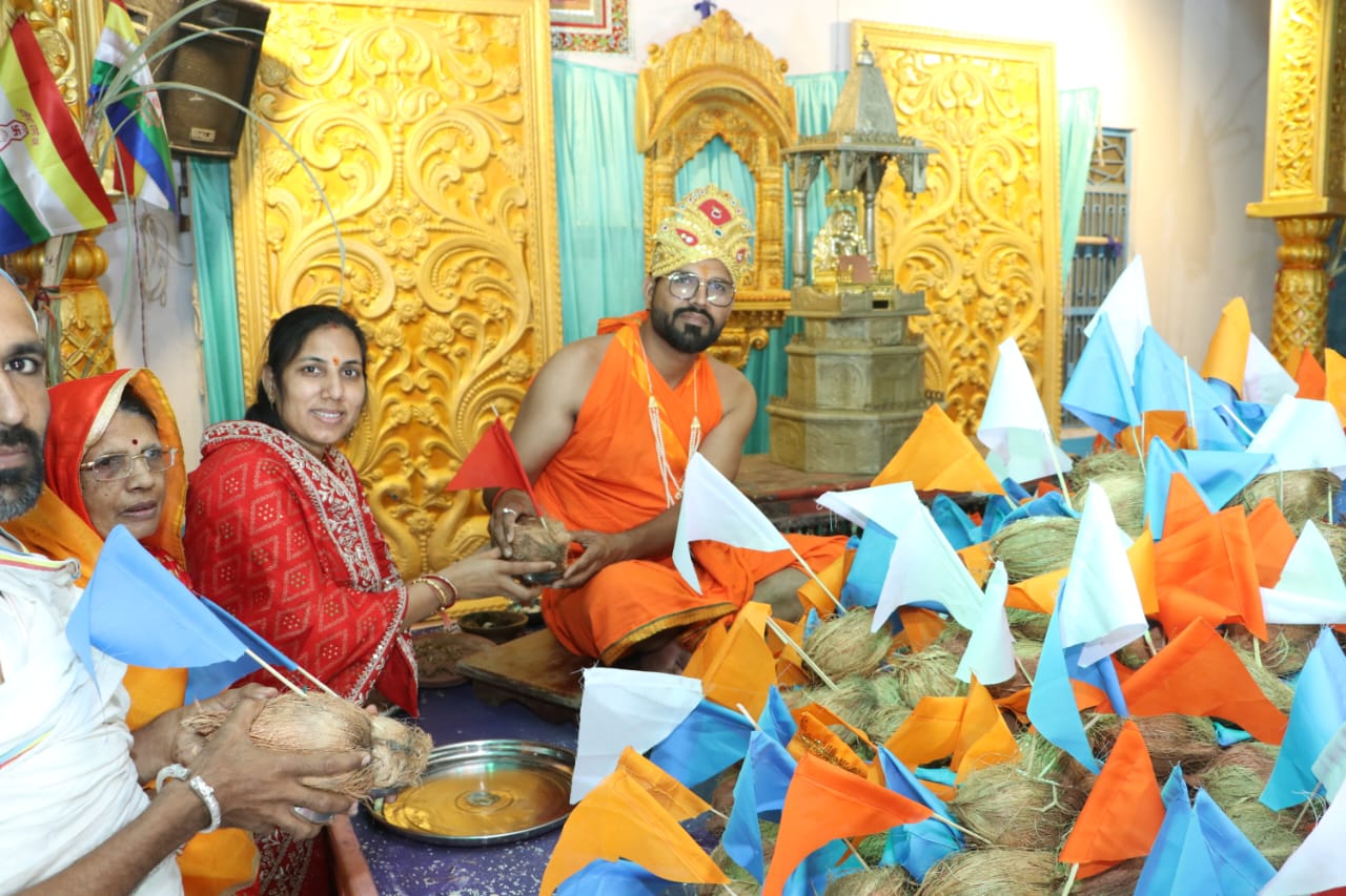 पारसोला। अंतर्मुखी मुनि पूज्य सागर महाराज, आर्यिका प्रसन्न मति माताजी और क्षुल्लक अनुश्रमण सागर के सानिध्य में चल रहे सात दिवसीय श्री भक्तामर महामंडल विधान अनुष्ठान के चौथे दिन 13 काव्य की आराधना करते हुए 728 श्रीफल के साथ 728 अर्घ्य सौधर्म इन्द्र शैलेश-अल्पा घाटलिया ने समर्पित किए।