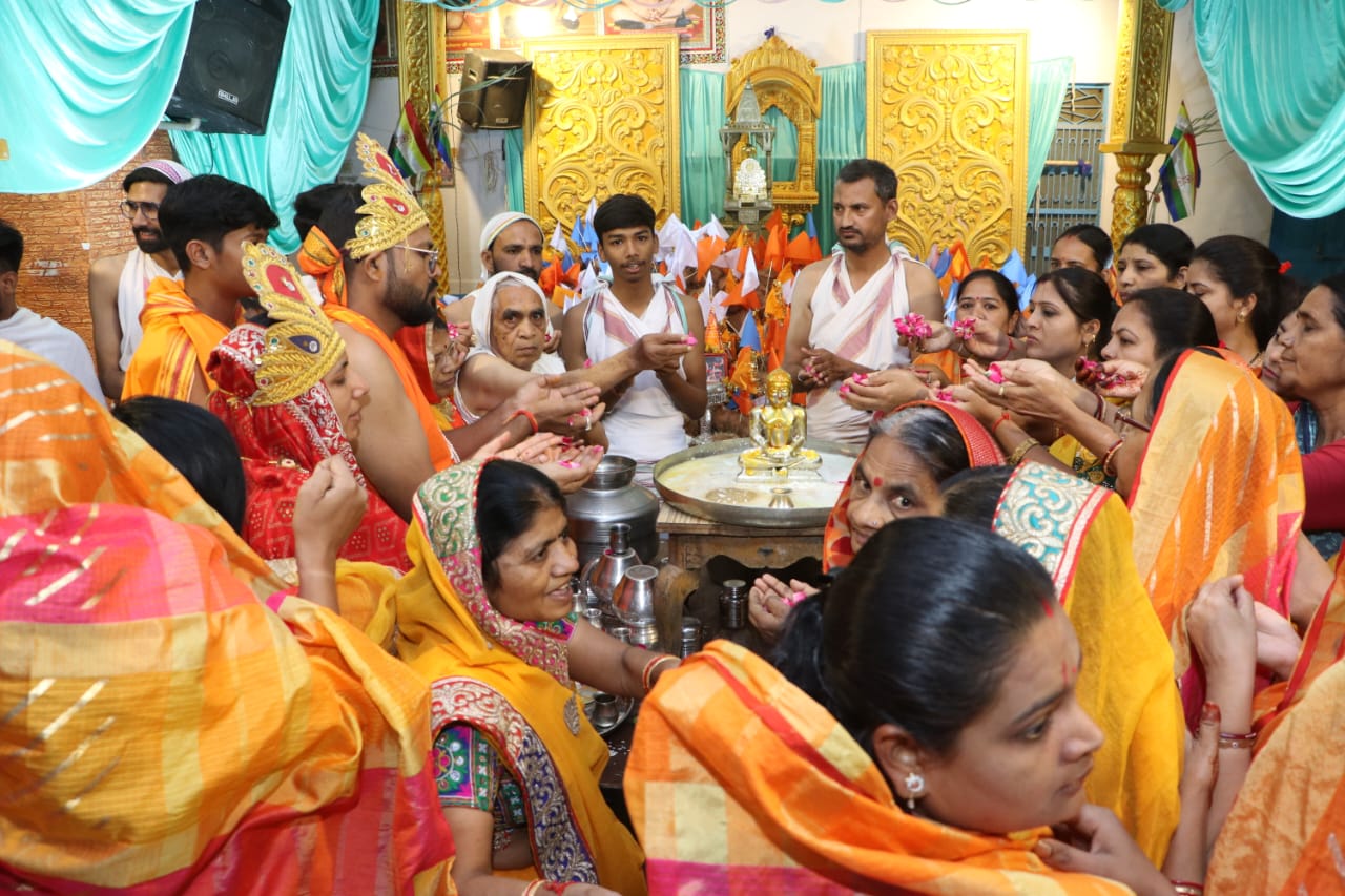 दशा हुमड़ दिगंबर जैन समाज, पारसोला की ओर से अंतर्मुखी मुनि पूज्य सागर महाराज, आर्यिका प्रसन्न मति माताजी और क्षुल्लक अनुश्रमण सागर के सानिध्य में हो रहे श्री भक्तामर महामंडल विधान में चौथे दिन 13 काव्य की आराधना करते हुए 728 श्रीफल के साथ 728 अर्घ्य सौधर्म इन्द्र शैलेश-अल्पा घाटलिया ने समर्पित किए। सुबह 5 बजे से अनार, अंगूर, दही, दूध से भगवान का अभिषेक अनुष्ठान में बैठे 108 श्रावक-श्राविकाओं द्वारा किया गया। पढ़िए यह विशेष रिपोर्ट…