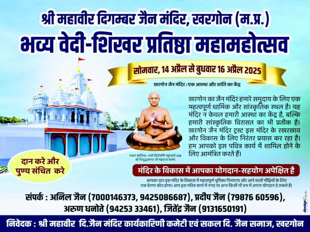 आचार्य श्री विशुद्ध सागर जी एवं 50 से अधिक साधुओं के मंगल सानिध्य में यह महोत्सव सकल दिगंबर जैन समाज, खरगोन, धर्मशाला समिति और निमाड़, मालवा एवं समस्त भारत के जैन समुदाय के सक्रिय सहयोग से किया जाएगा। श्री दिगंबर जैन मंदिर खरगोन के प्रदीप, अनिल, अरुण, जितेंद्र सहित पदाधिकारियों एवं समाजसेवी डेविड जैन ने कहा कि आपकी सहभागिता के लिए सादर आमंत्रण है। यह हम सभी के लिए एक सुनहरा अवसर है कि हम अपनी श्रद्धा, समर्पण और सहयोग से इस वेदी प्रतिष्ठा महोत्सव को एक यादगार और सफल आयोजन बनाएं। उन्होंने 13 अप्रैल को सुबह 8 बजे जैन संतों के आगमन पर अपनी गरिमामयी उपस्थिति से इस आयोजन को सफल बनाने का अनुरोध किया है।