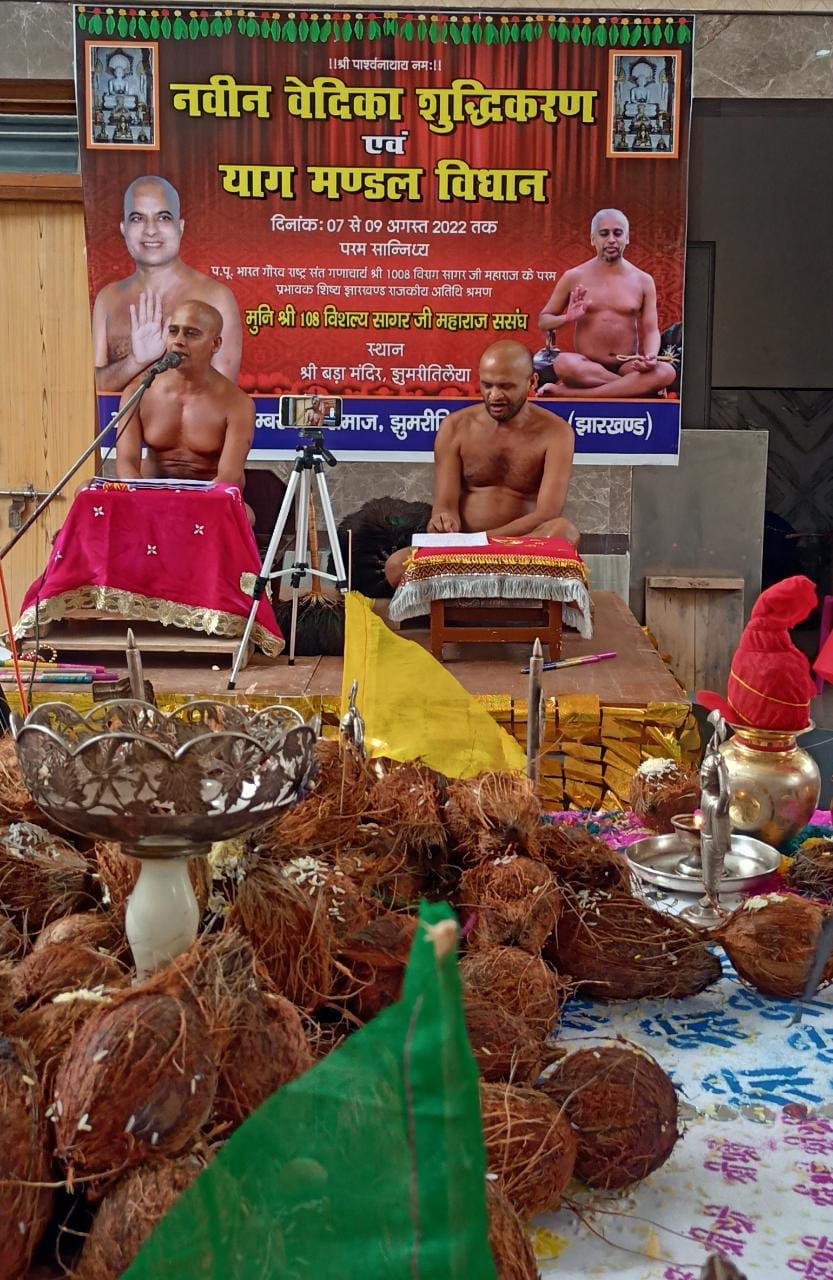 झुमरीतिलैया (कोडरमा)। सोमवार 8 अगस्त को वेदिका शुद्धिकरण कार्यक्रम के दूसरे दिन याग मंडल विधान का आयोजन हुआ। सबसे पहले प्रातः जैन मंदिर के मूलनायक 1008 पारसनाथ भगवान की प्रतिमा पर अभिषेक किया गया। इसके पश्चात परम पूज्य गणाचार्य श्री 108 विराग सागर जी महामुनिराज के परम प्रभावक शिष्य मुनि श्री 108 विशल्य सागर जी मुनिराज के मुखारविन्द से शांतिधारा मंत्रोचार किया गया। मूल वेदी में शांतिधारा करने का सौभाग्य हरक चंद अशोक,अनिल पाटोदी को प्राप्त हुआ। साथ ही छोटी प्रतिमा का भी अभिषेक शांतिधारा समाज के पदाधिकारियों एवं गण्यमान्य लोगों द्वारा किया गया।