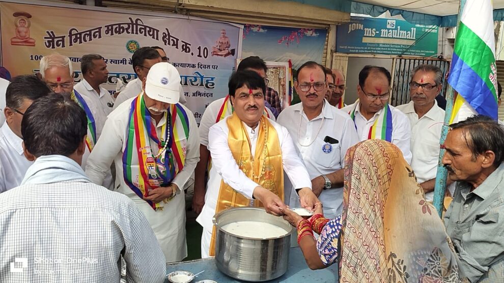 सागर।जैन मिलन मकरोनिया क्षेत्र क्रमांक 10 के द्वारा 1008 श्री महावीर स्वामी के जन्म कल्याण महोत्सव के अवसर पर सुबह विशाल वाहन रैली का सभी जैन मंदिरों से होकर अंकुर कॉलोनी जैन मंदिर में समापन हुआ। रैली का जगह-जगह फल ,मिष्ठान से स्वागत हुआ। दोपहर में श्री जी की शोभायात्रा में अपनी सहभागिता दी तथा इस अवसर पर समाज के सैकड़ों परिवारों ने अपने-अपने घरों के सामने रंगोली बनाकर श्री जी की आगवानी करते हुए आरती उतारी एवं श्रीफल अर्पित किया। जैन मिलन द्वारा मकरोनिया चौराहा, गुलझार भवन से खीर का वितरण किया गया। कार्यक्रम में मुख्य अतिथियों के द्वारा दीप प्रज्वलित किया गया एवं महावीर प्रार्थना अति वीर कमलेन्द्र जैन ,राष्ट्रीय मंत्री गुलझारीलाल जैन वरिष्ठ समाजसेवी ,अतिवीर अरुण चंदेरिया क्षेत्रीय अध्यक्ष, वीर सुरेश जैन अध्यक्ष द्वारा की गई ।वीर सुरेश जैन एवं राजेश जैन ने बतलाया कि खीर वितरण का कार्यक्रम जैन मिलन द्वारा पिछले 15 वर्षों से लगातार किया जा रहा है। आज भी महावीर स्वामी के 2623 वें जन्मोत्सव जन्म कल्याणक की खुशी में सदस्यों द्वारा बधाई नृत्य किया गया एवं लगभग 3000 भक्तों को प्रसादी के रूप में खीर का वितरण किया गया।