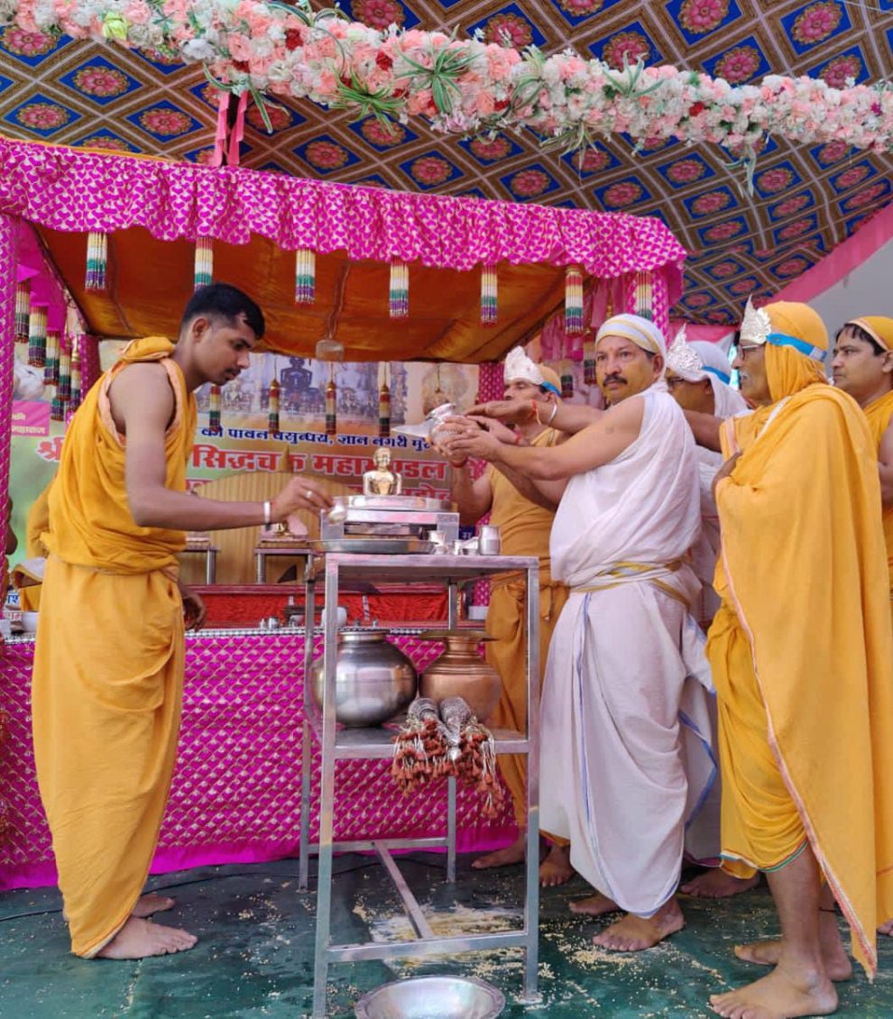 मुरैना (मनोज नायक)। बड़े जैन मंदिर, मुरैना में मंगलवार को श्री सिद्धचक्र महामण्डल विधान का शुभारंभ घटयात्रा से हुआ। क्षुल्लिका अक्षतमति माताजी, बाल ब्रह्मचारिणी बहिन अनीता दीदी, मंजुला दीदी, ललिता दीदी, शकुंतला बाई, रामकली बाई एवं विधानाचार्य पंडित राजेन्द्र शास्त्री, मंगरौनी वाले के सान्निध्य में श्री सिद्धचक्र महामण्डल विधान के शुभारंभ पर प्रातः देवआज्ञा, आचार्य निमंत्रण के बाद घटयात्रा जुलूस निकाला गया।