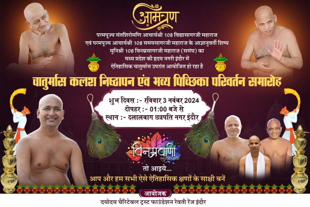 संत शिरोमणि आचार्य श्री विद्यासागर जी महाराज के परम प्रभावक शिष्य मुनि श्री 108 विनम्र सागर जी महाराज, मुनि श्री निस्वार्थ सागर जी, मुनि श्री निसर्ग सागर जी एवं क्षुल्लक श्री हीरक सागर जी महाराज ससंघ का भव्य पिच्छिका परिवर्तन समारोह 3 नवंबर 24, रविवार को दोपहर 1.30 बजे से दलाल बाग, छत्रपति नगर, इंदौर में होगा। पढ़िए सतीश जैन की रिपोर्ट…
