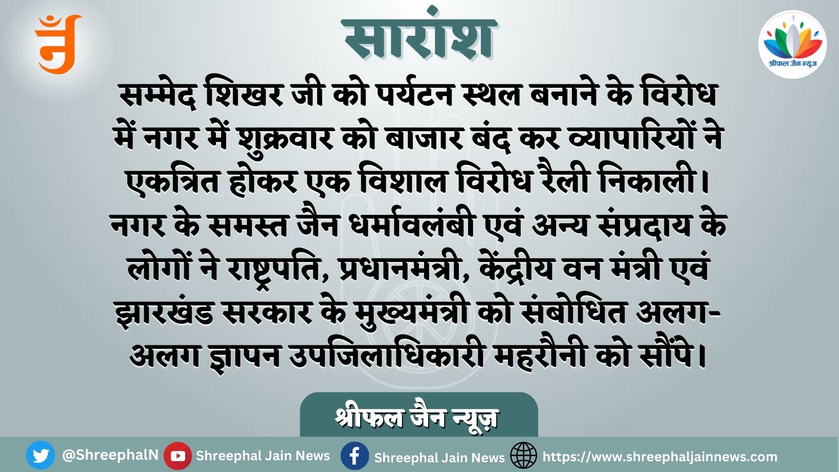 महरौनी (ललितपुर)। सम्मेद शिखर जी को पर्यटन स्थल बनाने के विरोध में नगर में शुक्रवार को बाजार बंद कर व्यापारियों ने एकत्रित होकर एक विशाल विरोध रैली निकाली एवं जमकर नारेबाजी की। शासन की मंशा पर अंकुश लगाने को लेकर नगर के समस्त जैन धर्मावलंबी एवं अन्य संप्रदाय के लोगों ने राष्ट्रपति, प्रधानमंत्री, केंद्रीय वन मंत्री एवं झारखंड सरकार के मुख्यमंत्री को संबोधित अलग-अलग ज्ञापन उपजिलाधिकारी महरौनी को सौंपे।