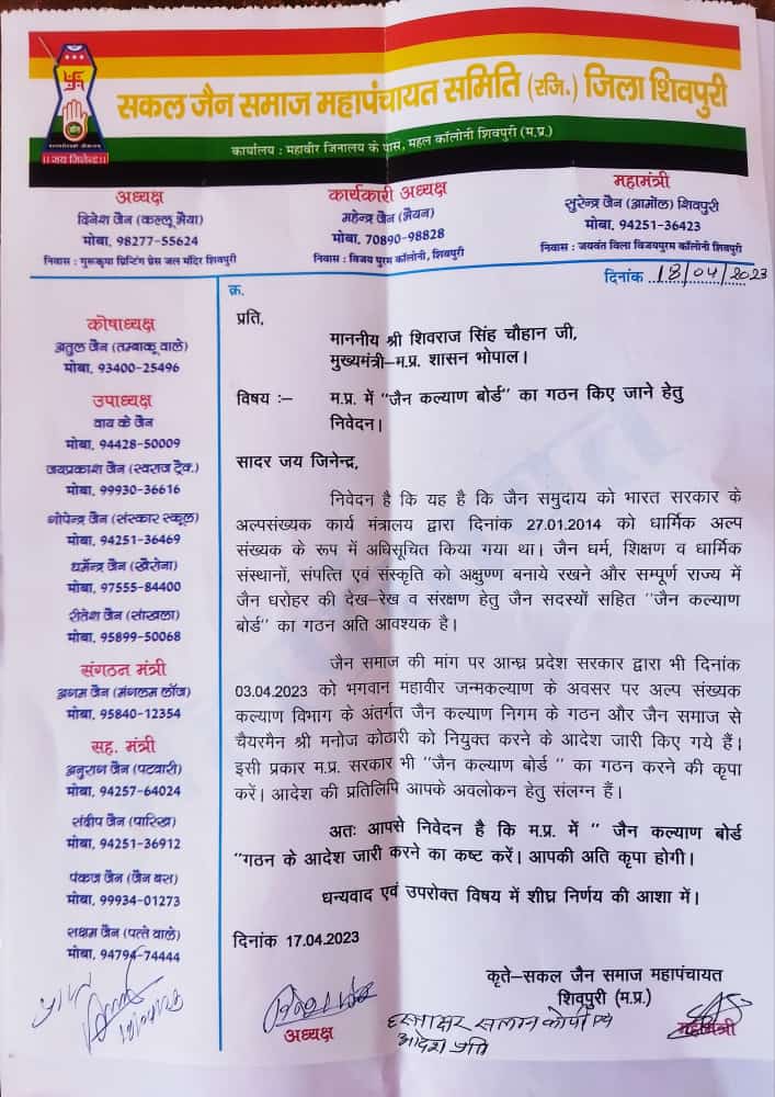 म. प्र. में बोर्ड बनाये जाने हेतु शिवपुरी जैन समाज द्वारा द्वारा आज 19 अप्रैल को मुख्यमंत्री के नाम जिला कलेक्टर को ज्ञापन सौंपा गया। संगठन के संरक्षक विजय जैन और विपुल जैन ने कहा कि जैन कल्याण बोर्ड के गठन से सभी जैन तीर्थ स्थानों व संपत्तियों की जीपीएस कोडिंग हो जिससे इन पर कोई अनधिकृत कब्जा नहीं कर पाए और सभी जैन शिक्षण व धार्मिक संस्थानों के संचालन में आने वाली मुश्किलों को बोर्ड के माध्यम से हल करवाया जा सके।