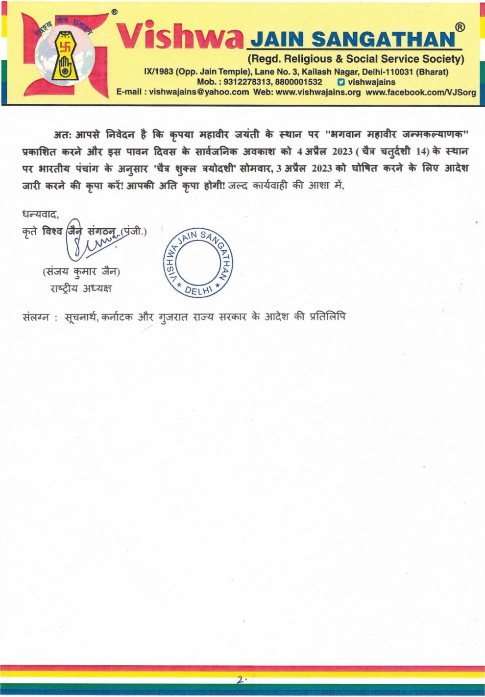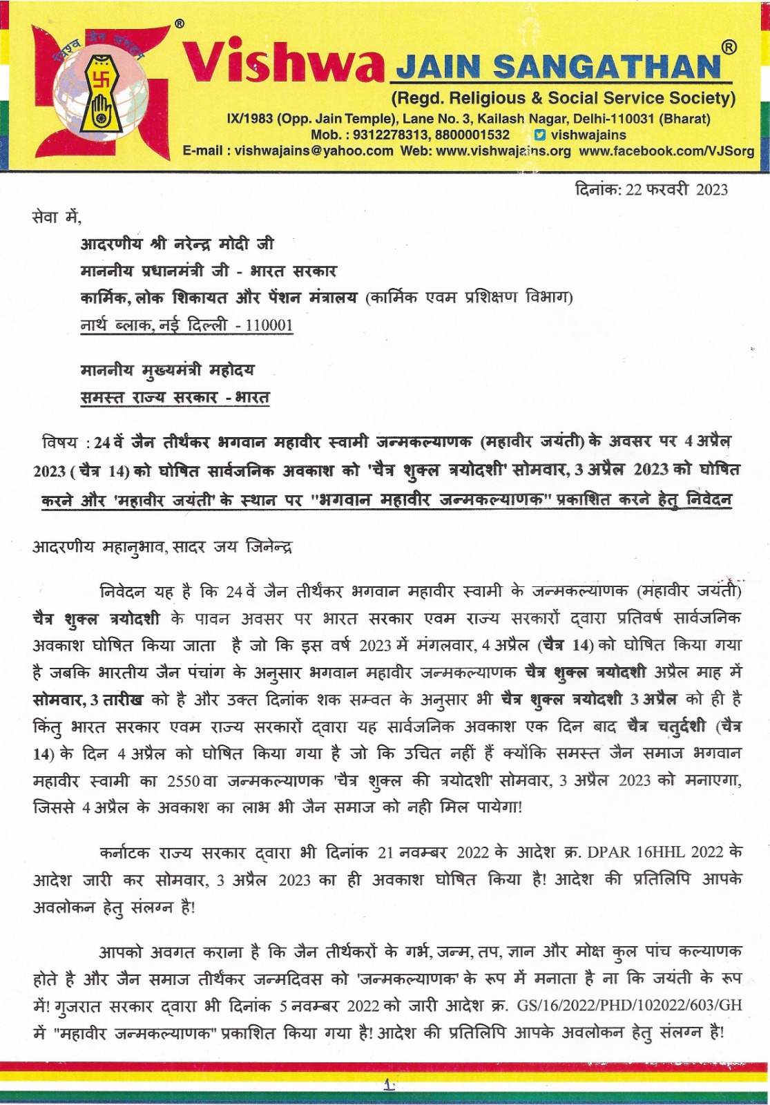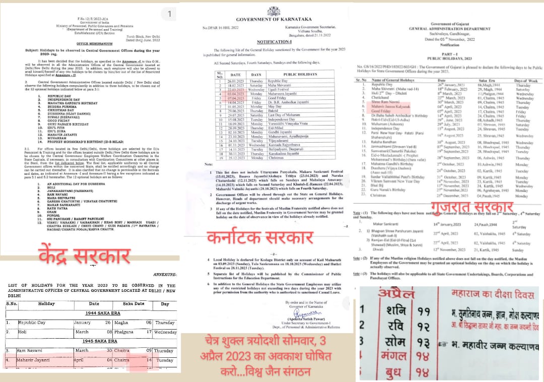 विश्व जैन संगठन के अध्यक्ष संजय जैन ने कहा कि भारत सरकार के भारत सरकार के कार्मिक एवं पेंशन मंत्रालय द्वारा जारी सार्वजनिक अवकाश की सूची में भगवान महावीर के जन्म दिवस “चेत्र शुक्ल त्रयोदशी” सोमवार, 3 अप्रैल 2023 को है लेकिन विभाग द्वारा चेत्र 14 को अवकाश घोषित किया है । जिसका कोई औचत्य नहीं है। कर्नाटक सरकार द्वारा भी 3 अप्रैल को ही सार्वजनिक अवकाश घोषित किया है ।