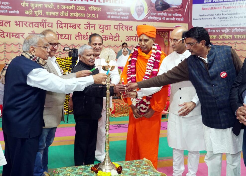 अयोध्या। अखिल भारतवर्षीय दिगंबर जैन युवा परिषद् के 49 वें स्थापना दिवस पर अवार्ड समर्पण और राष्ट्रीय अधिवेशन रविवार को दोपहर 1 बजे शाश्वत तीर्थ अयोध्या में गणिनी प्रमुख श्री ज्ञानमति माताजी ससंघ, आर्यिकाश्री चंदनामति माताजी, पीठाधीश श्री रवींद्रकीर्ति स्वामी जी के मार्गदर्शन में आरंभ हुआ। युवा परिषद के राष्ट्रीय अध्यक्ष डॉ.जीवनप्रकाश जैन ने इसमें अध्यक्षता की भारतवर्षीय तीर्थ क्षेत्र कमेटी के राष्ट्रीय अध्यक्ष जम्बूप्रसाद जैन, गाजियाबाद मुख्य अतिथि के रूप में उपस्थित रहे।